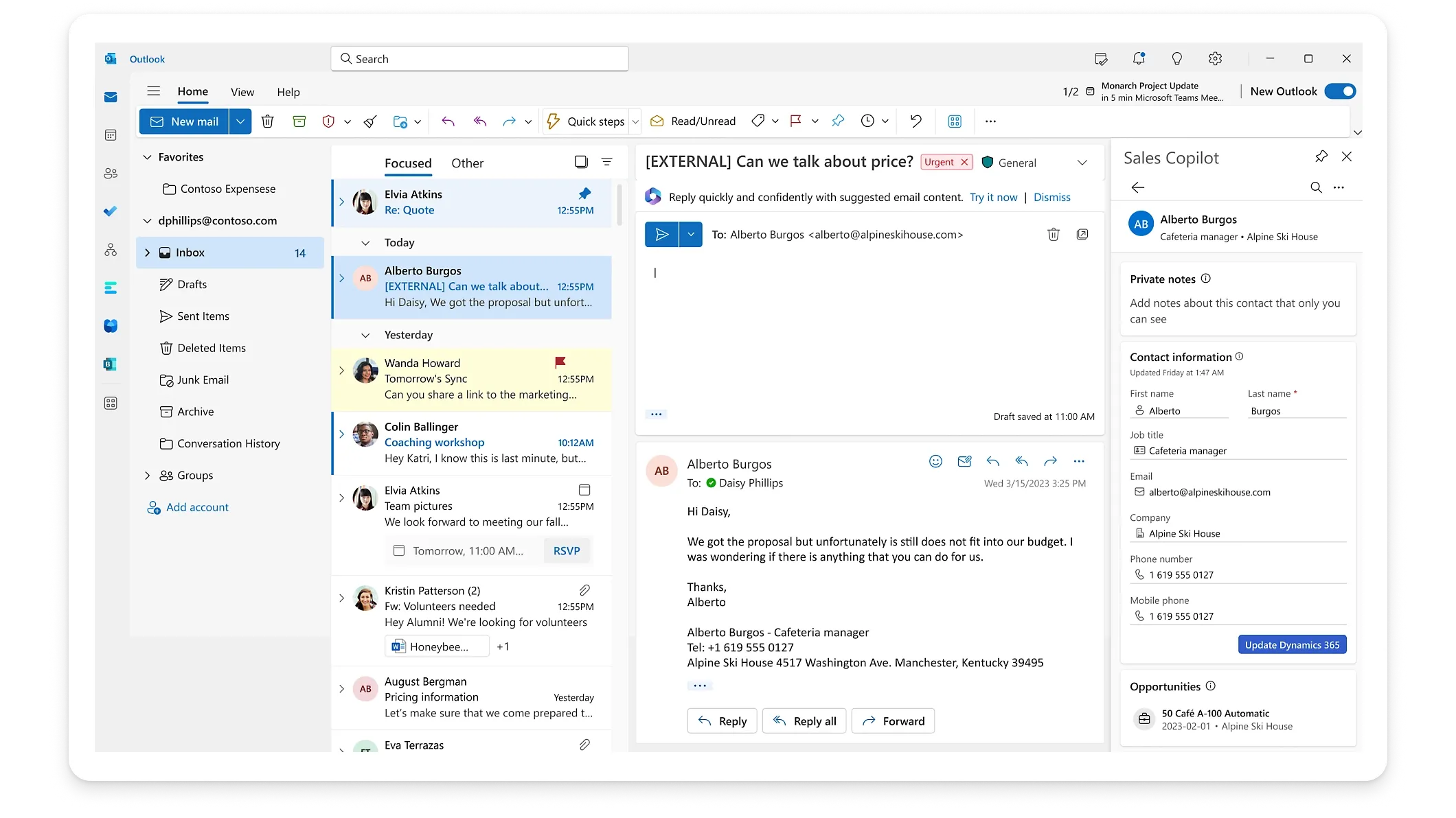 Use Copilot to summarize emails and meetings and generate customer-specific emails with Dynamics 365 data. Focus on the right customers with AI-based scoring models, opportunity summaries, and data visualizations. Minimize app-switching with automatic updates in Microsoft 365 apps.