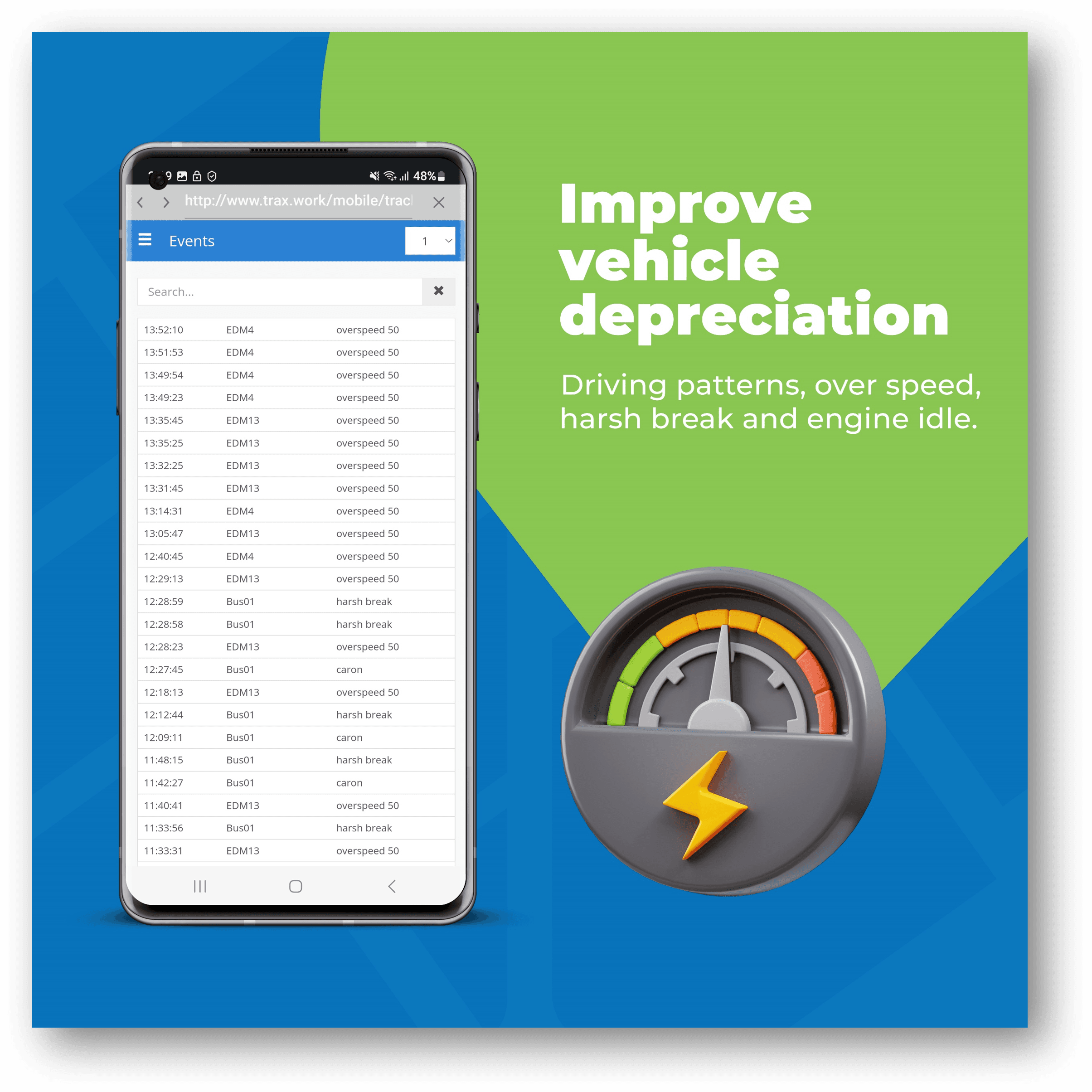 The system's driver behavior monitoring capabilities, such as overspeed, harsh braking, and engine idling, enable you to improve driver safety and reduce vehicle depreciation, repair, and maintenance costs.